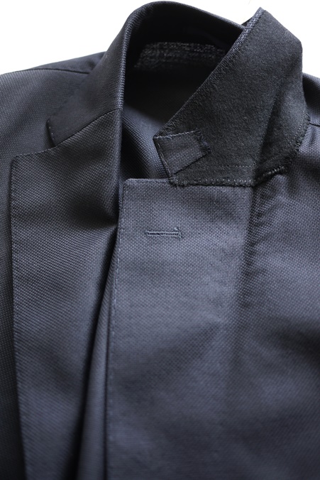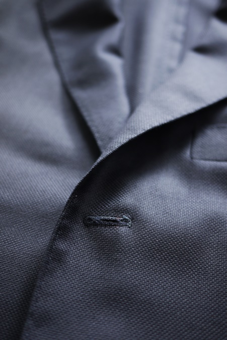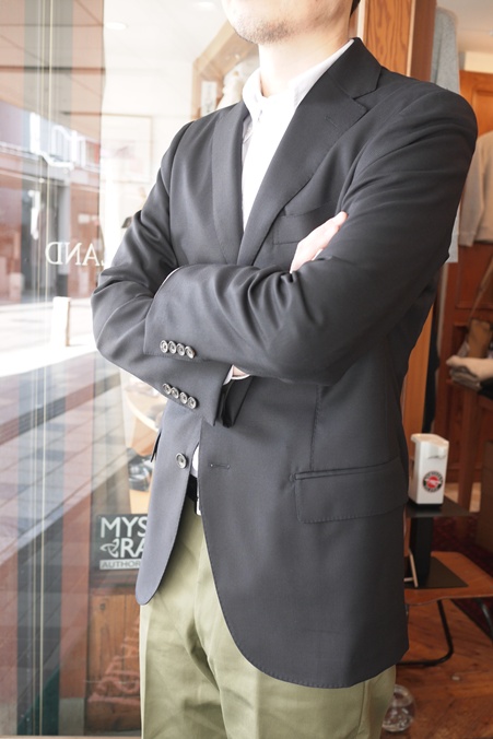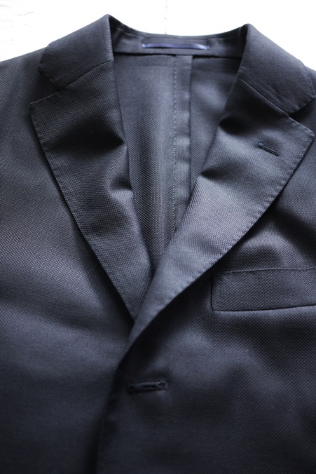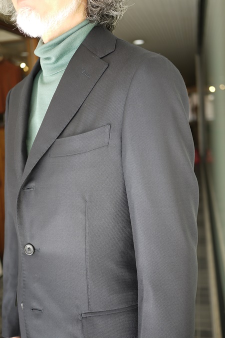 ラペルの返りも美しく、あくまでもナチュラルな肩。