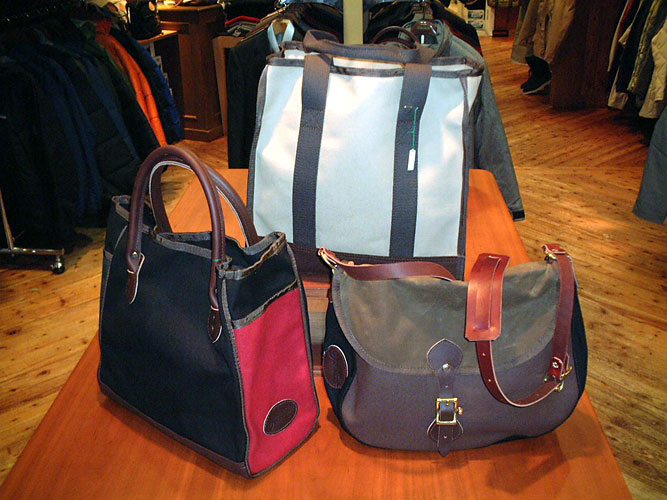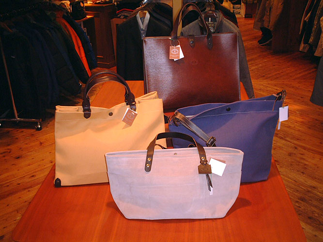 フランス製のオシャレな実用バッグメーカー。使い込む程に味の出るコットン素材(中)のものに加え、リサイクルレザー(奥)やスウェード(手前)のものも素材の質感が楽しめます。