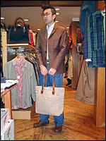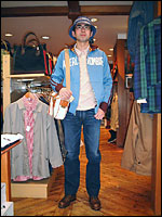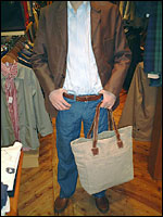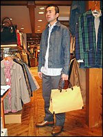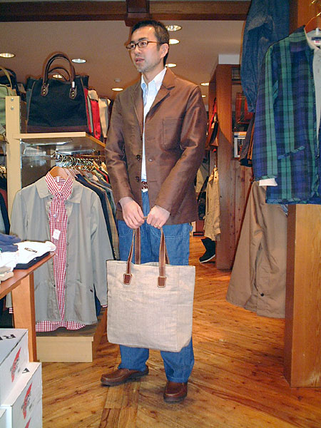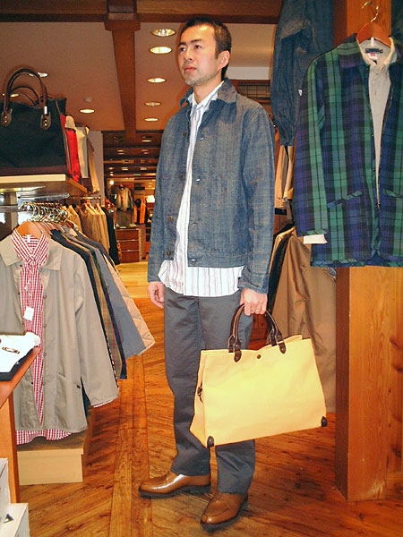 色のトーンを抑えてシャツとバッグをポイントにしました。パンツもnorthernisland別注の、F.O.Bの新色グレーでシックです。