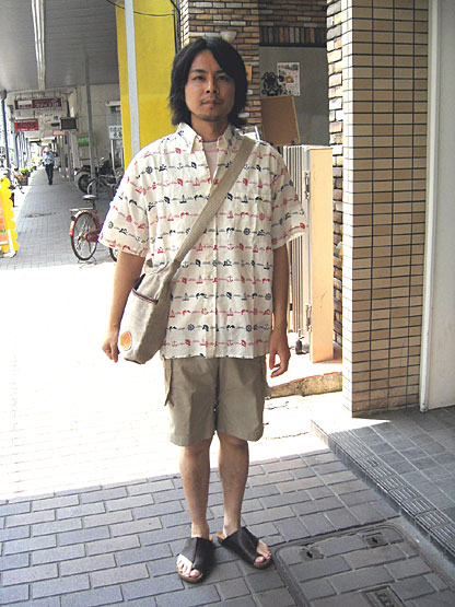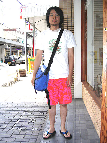 シャツはやっぱりレイン・スプーナー。珍しいヘンプ・コットン素材です。デザインはパーム・グラフィックスです。ひとあじ違うレインです。バッグはおなじみのテラ・パックスです。買い物にぴったりですね。ショーツはカリマーです。素材、カッティングともに最高です。ポケットも多くたいへん重宝します。サンダルはスペイン・メイドのロードホッグス。リーズナブルなレザーサンダルです。