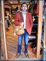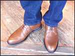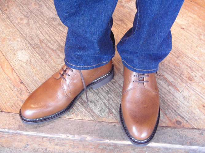 2. こちらのジャケットはフランコ・プリンツィバーリのレディメイドです。素材は何とロロ・ピアーナ製のツイードです。レイン・システム仕上げのため、多少の雨も平気です。靴はパラブーツの新作、デスカルテス。ロングノーズの美しいチャッカーブーツです。バッグはラグタイム。グローブ・レザーを贅沢に使用し、さらに製品洗いをかけています。