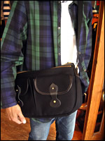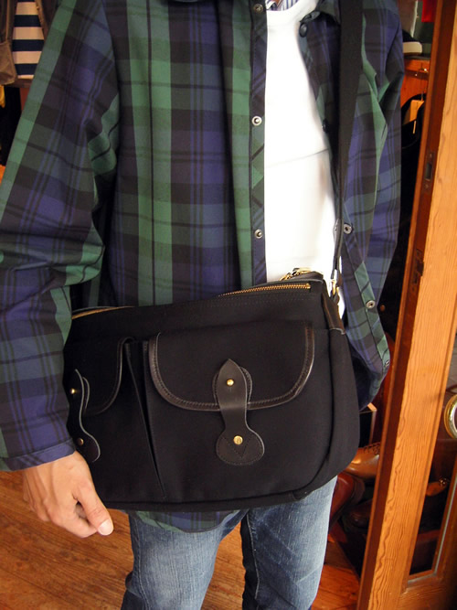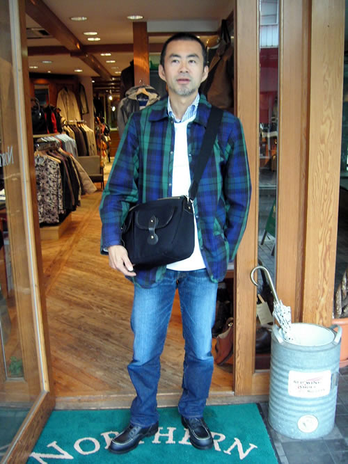 3.アウターはラベンハムのコットン1枚仕立て。たいへん活用範囲の広いジャケットです。イギリス伝統のブラック・ウォッチ柄です。バッグはグリップス。フィッシングバッグを現代風にアレンジしています。靴はレッド・ウィングの100周年限定モデル、RW8283です。残りわずかとなりました。