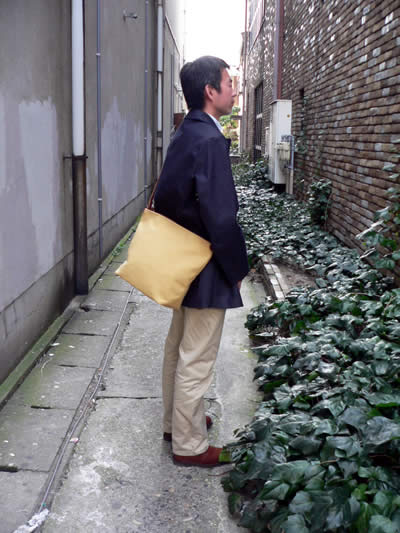 こちらはコットンジャケットのコーディネイトです。同系色でまとめると、こんなにクールです。カジュアルすぎないリサイクル・レザー・トートとロブが全体を引き締めます。