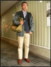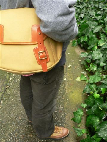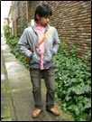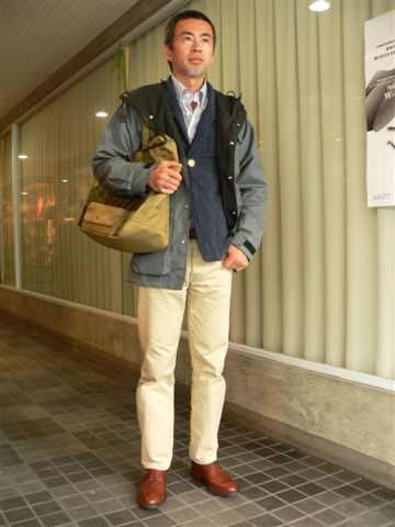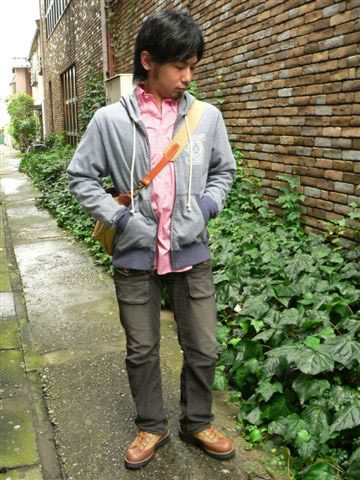 | コーディネート NO,1 まずは片桐です。このオトコは入社してまだ4ヶ月なんですが、もうベテランみたいになってます。写真も妙に撮られなれして、なかなかヘンなカットが撮れなくなりました。まずアウターはテールゲートのヴィンテージ感あふれるスエット・パーカーです。ネイビーの、微妙なシモフリがかっこいいですね。シャツはノーザンアイランド・ネームのオリジナルです。ブロードのギンガムで、長袖BDのプル・オーバーをつくりました。襟はブルックスを意識してます。 パンツはFOBの0252です。コレ、ロング・セラーになってます。洗いをかけた生地と、体型を選ばないシルエットが人気です。片桐はサッカーをやってて(もちろんヘナチョコです)、モモがわりと太いんですが全然へいちゃらです。 靴はおなじみダナー・ライトです。やわらかい履き心地の大定番。ダナーはこれが黒・茶とあれば、他はいりません。 バッグはノーザン別注色のデインズ&ハサウエイです。英国伝統のカバンを、品質はそのままで、ちょっとモダンに作りました。サイズもいちばん重宝する、ちょっと余裕のある大きさです。今っぽいアメカジの提案です。
