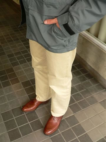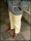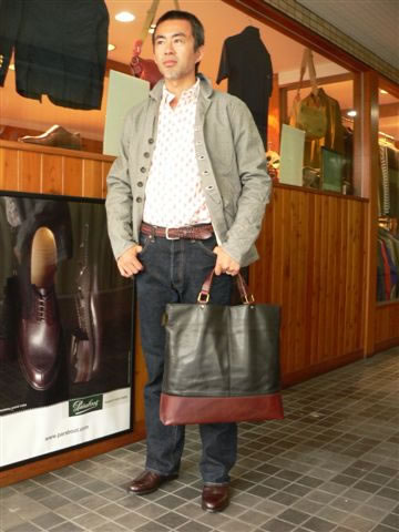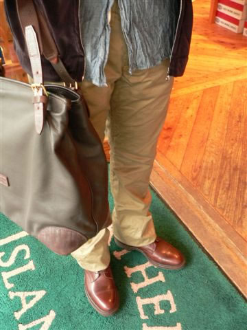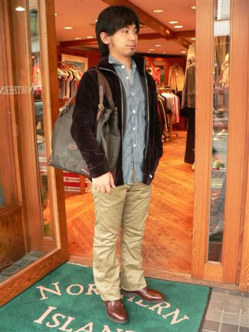 | コーディネート NO,4 トリは片桐です。鳥にたとえると、何ですかね。ドバト?ご意見お待ちしてます。こんどはヨーロッパっぽいかんじにしてみました。オトナのジャージとして人気のグラソン、ベロア・ジップです。コレ、ちょっと羽織ってのおでかけにチョー便利な一枚です。ビンボーくさくならないので、ちょっとコンビニまで、なんてときに最高です。そこでカワイイコにあっても、まったく問題なしですね。シャツはFOBのシャンブレー・ワークです。パンツもFOBの0242。この組み合わせはノーザンの、アメカジ経験豊富な30代に人気のあわせです。やりすぎないところがFOBの魅力ですね。旬を追いすぎると、あとでエライ目にあいますが、そんなものはノーザンは置いてません。 そして靴にはクロケットのコニストン。某ノーザンプトン・メーカーのカントリー・ブーツのようなエグさはありません。スーツからカジュアルまで違和感なく使えるブーツです。そしてバッグはデインズ&ハサウエイのレザー・トート。次回入荷分から、大幅な値上げになります。だいたいこんな価格、最初からよくやれたもんです。アンビリーバボーでしたね。残りわずかです。