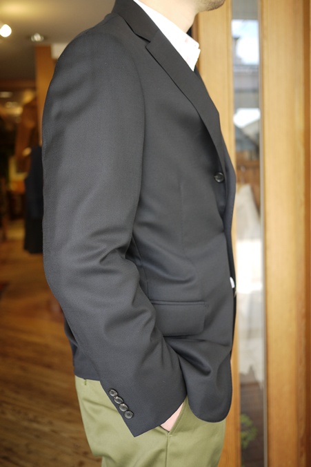 ラペルの返りも美しく、あくまでもナチュラルな肩。