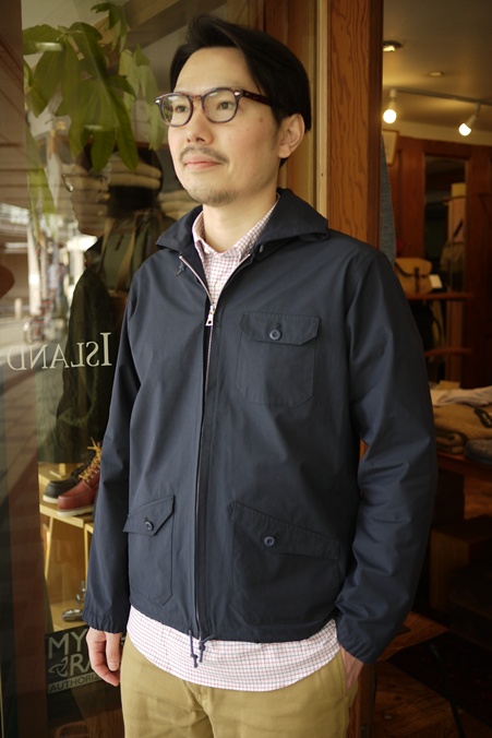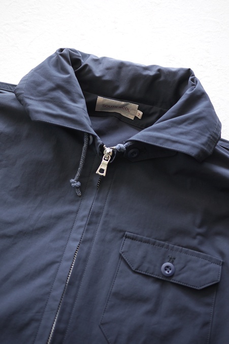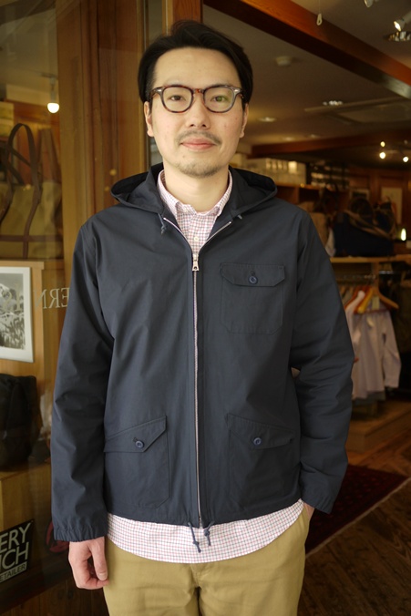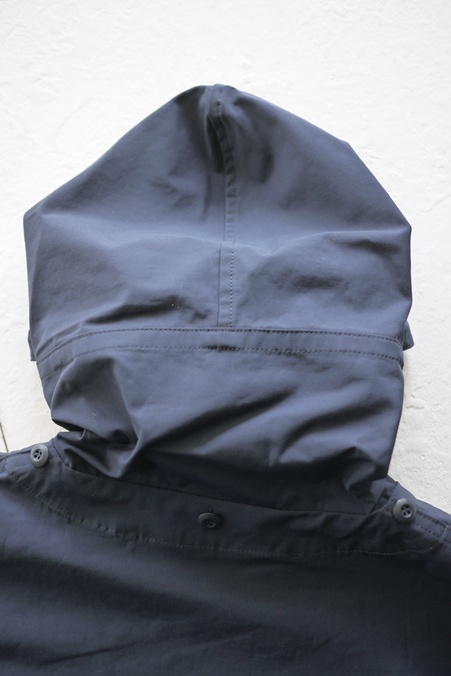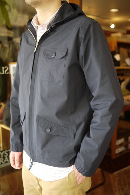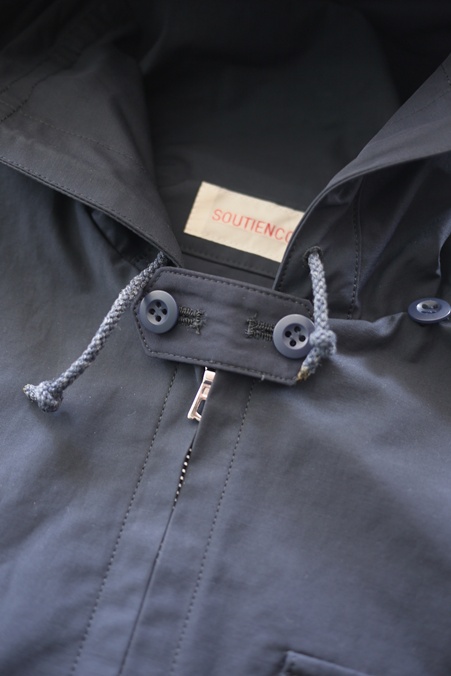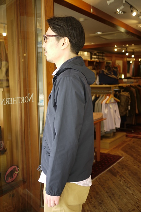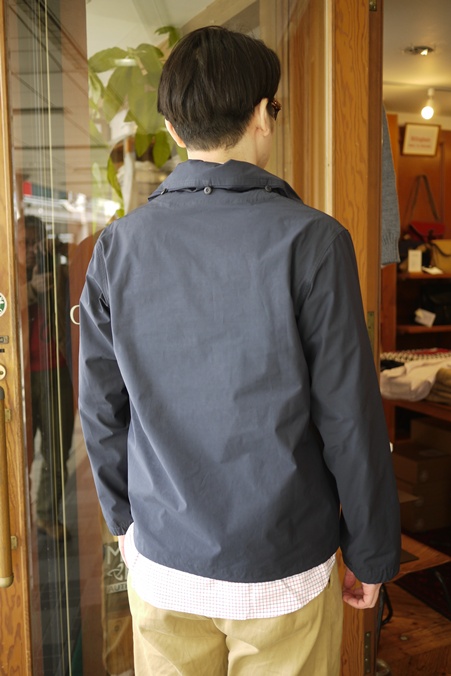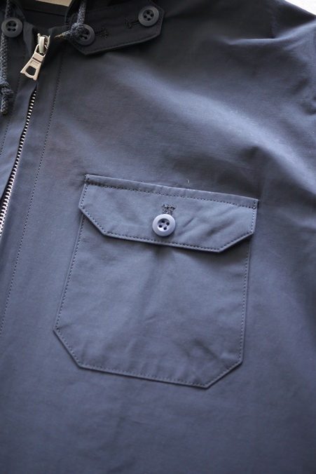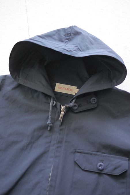 襟に折りたたんで収納できるフードつきのブルゾン。