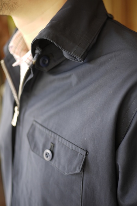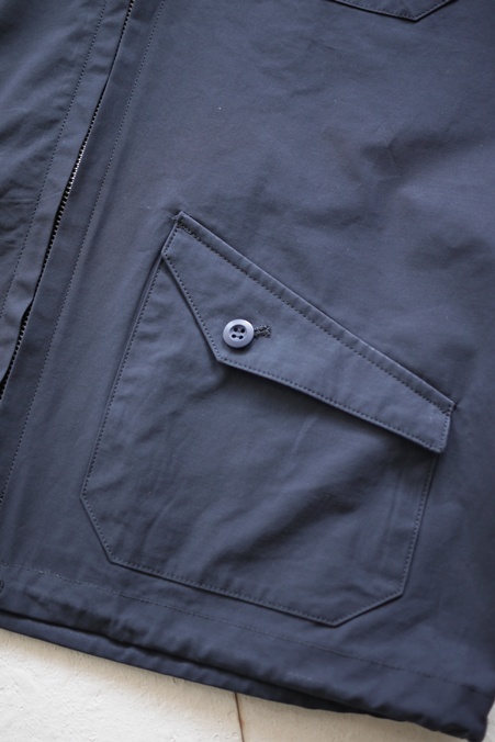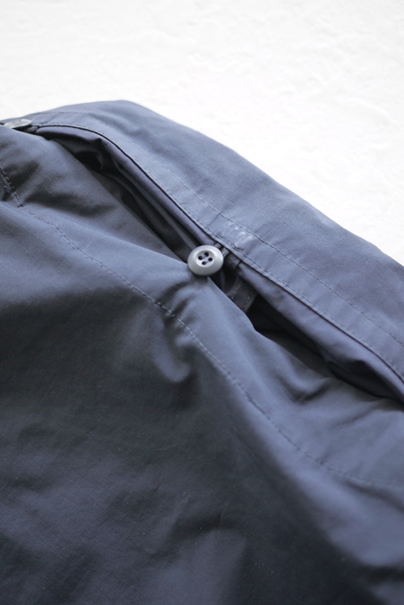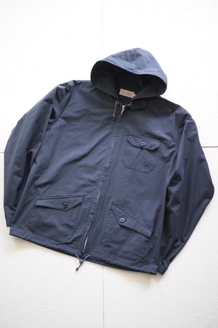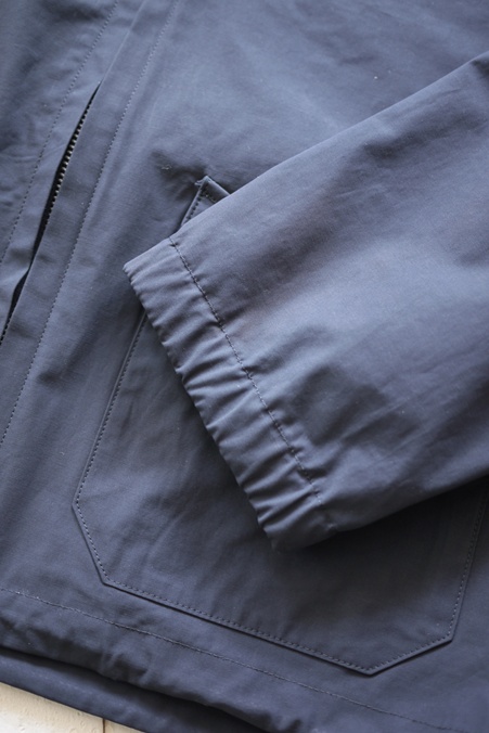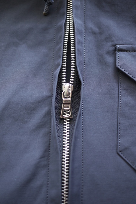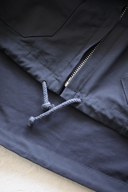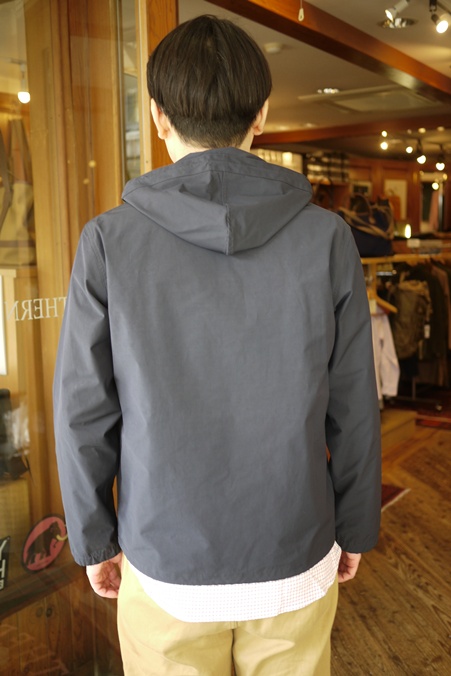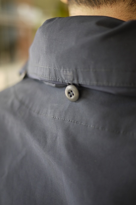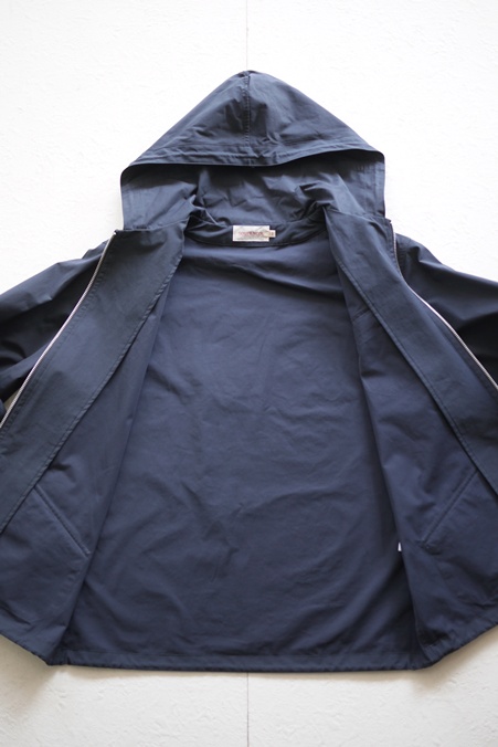 襟に折りたたんで収納できるフードつきのブルゾン。